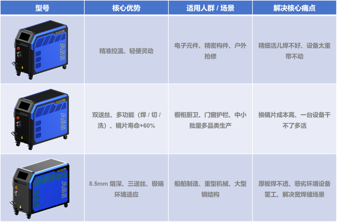 大族激光推出的蓝晶系列手持激光焊产品,涵盖A55、A65、A85三款机型,为不同工业场景提供了针对性解决方案。