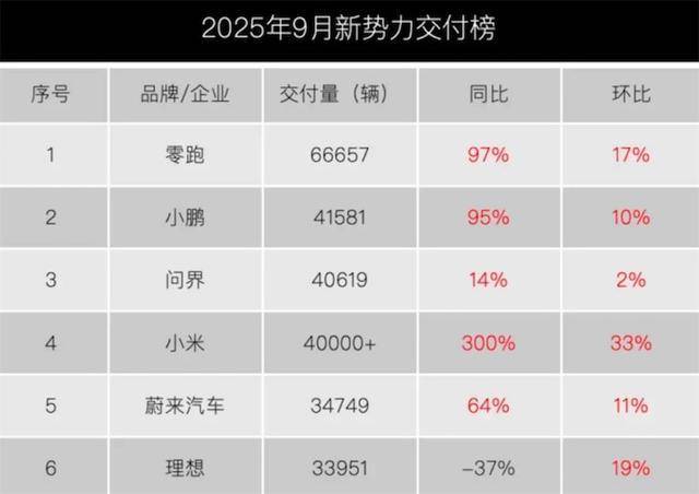 月销4万+这个级别有两位“小”字辈选手,小鹏和小米。小鹏汽车9月交付4.16万台,同比近乎翻番,创下历史新高,今年1-9月累计销量已超31万台,同比暴涨218%。持续热销的MONA M03,以及造型独特的全新P7,都吸引着许多年轻客群的关注。值得期待的是,小鹏汽车即将推出增程新车,2026年还计划实现现L4级自动驾驶技术量产。
